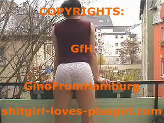 Redhead babe shits a big one in white panties. She did it on a public balcony.