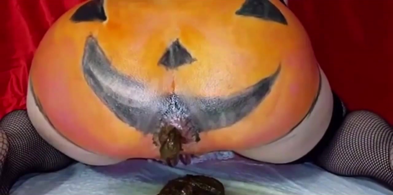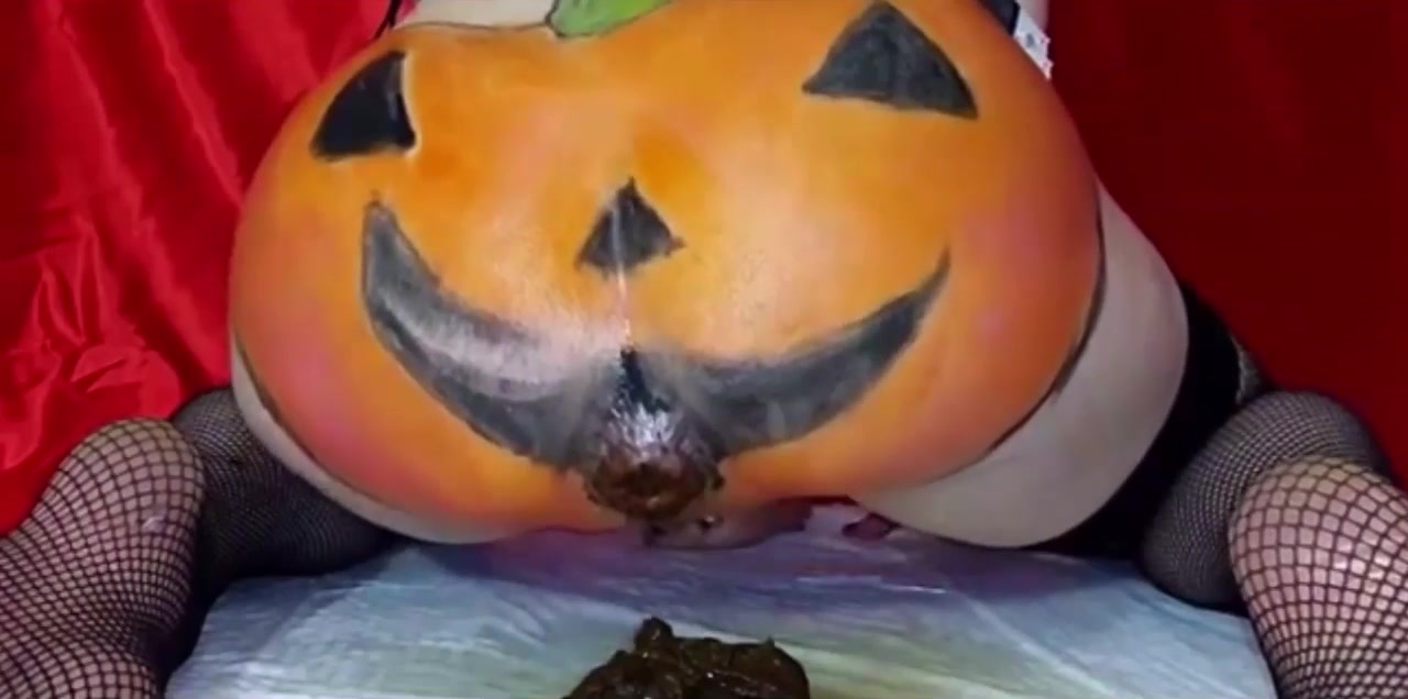 Inventive and hot scat girl painted her ass as a pumpkin and farts and shits some smily dark shiny shit and double fingers her asshole