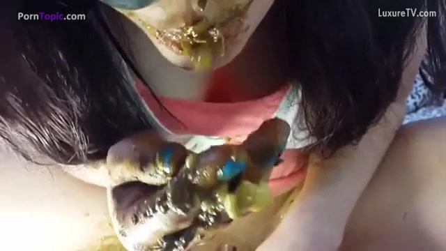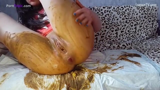 Dark haired college girl smears poop on her nude body. She's masturbating with fresh shit until reaching climax.