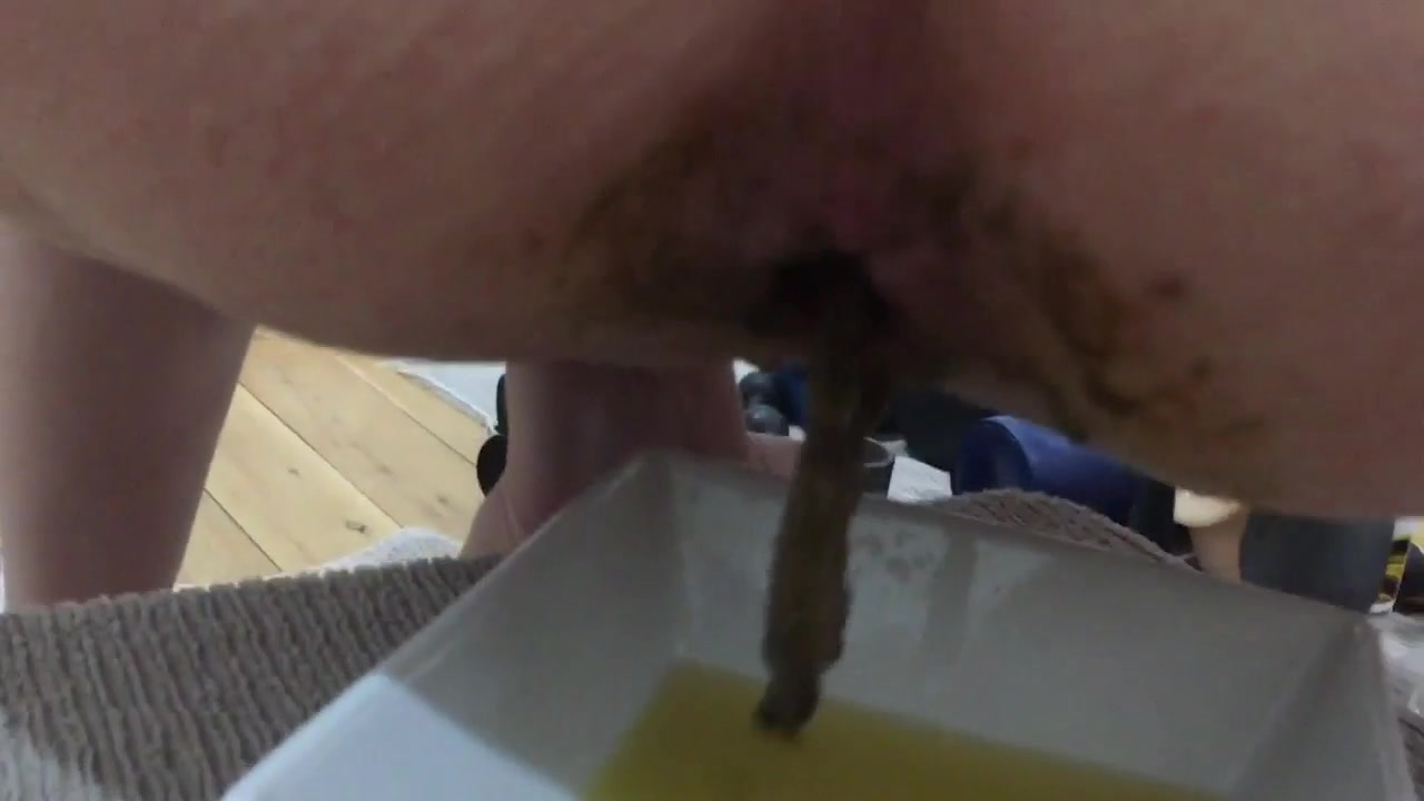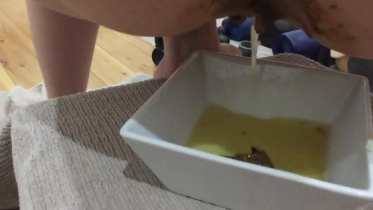 Chubby babe sits naked on her knees and she's peeing and pooping in a plastic bowl.