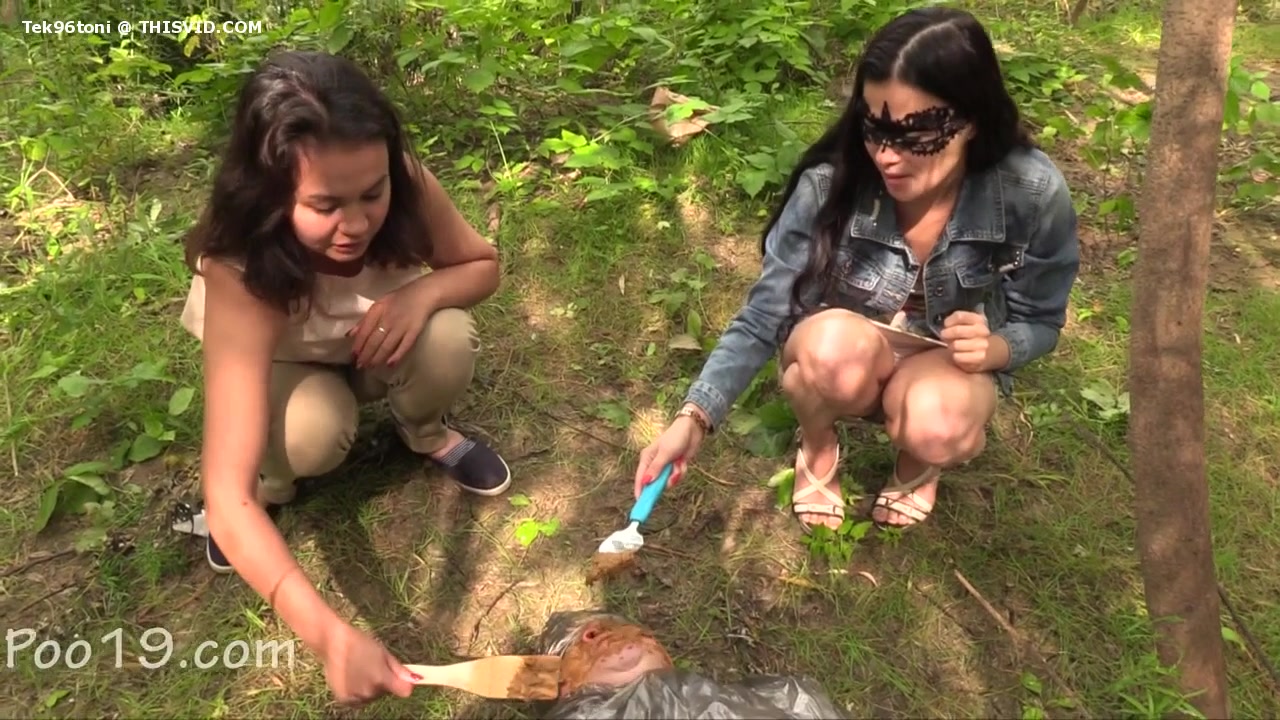 His opened mouth is a real toilet. Two girls are pooping in his opened mouth by turn.