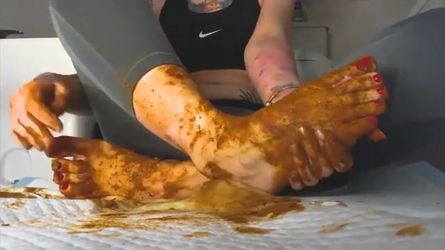 Tattooed college girl smears fresh shit on her sexy feet. She wants to masturbate in unique way.