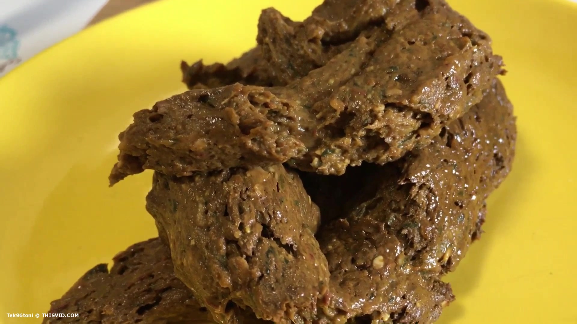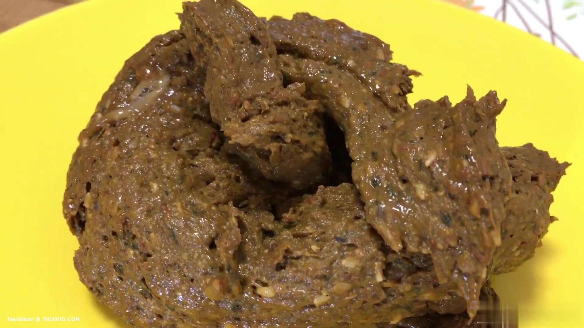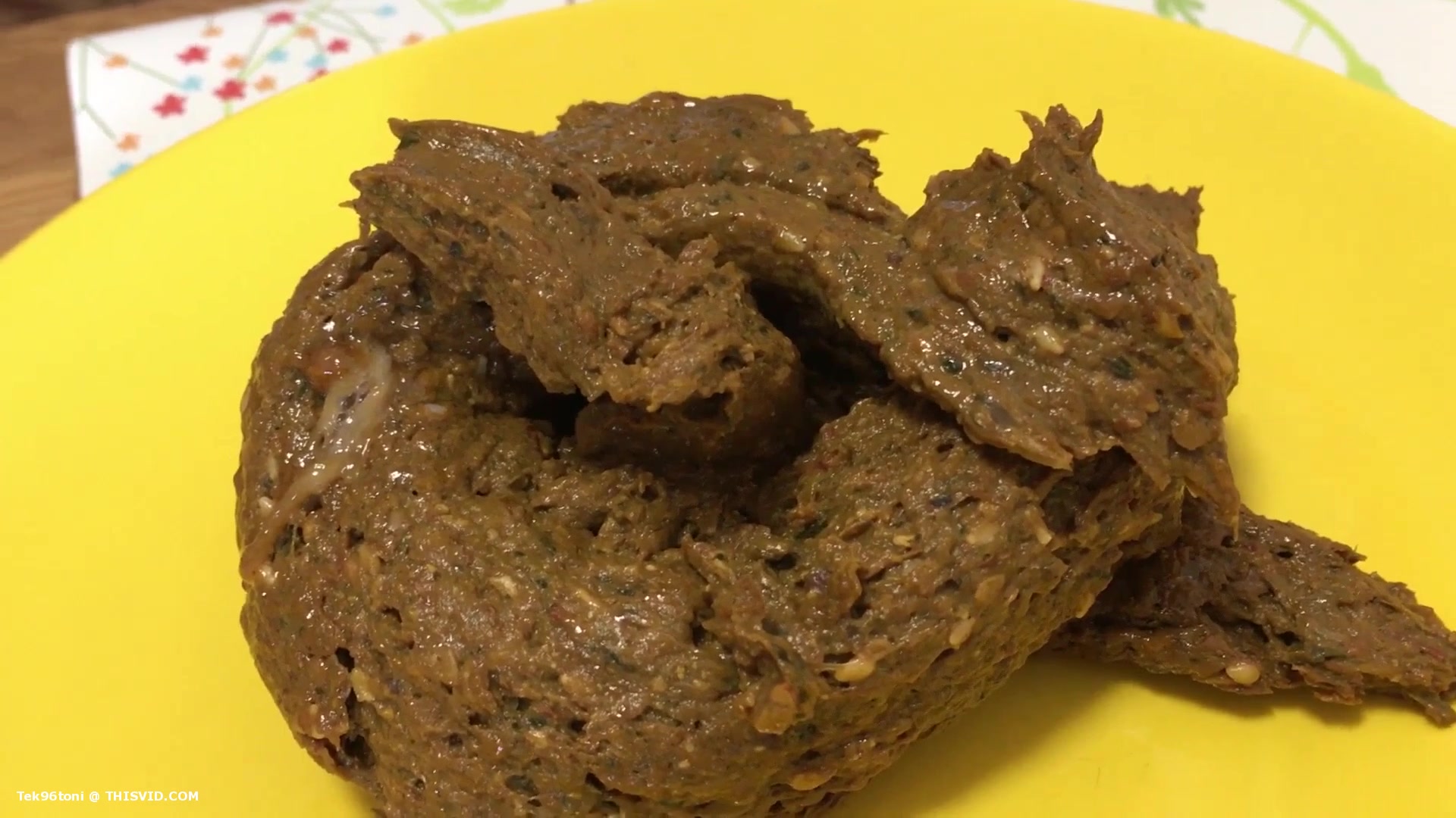 Beautiful blonde sits naked on her knees and she's pooping on a yellow plate.