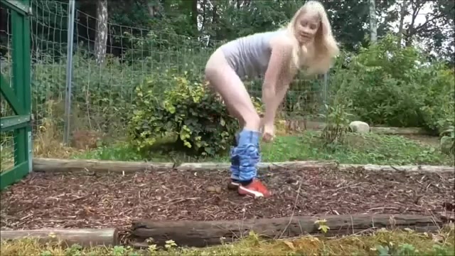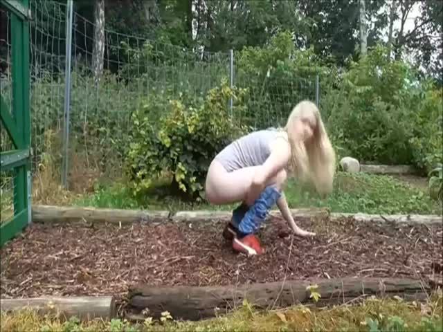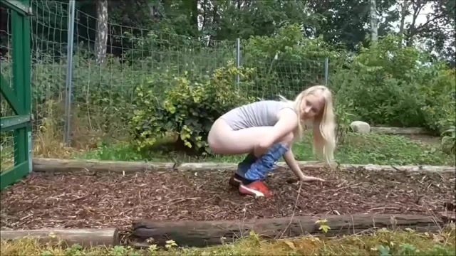 «Nice short video, where a Swedish lady really is enjoying pooping for us, as evident from the big grin on her face; she has nice pubic hair, and,after she has dropped her load, she approaches to show us her asshole, a little stained, in close-up, and then her deposit on the garden path. Favourite, because Swedish scat models have been rare.»