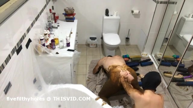 Brunette babe sits on her knees and she gets her tight ass fisted hard. She loves smearing poop.