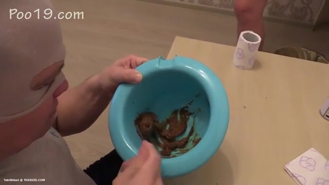 Chubby babe forced her male slave to eat fresh shit from a glass bowl.