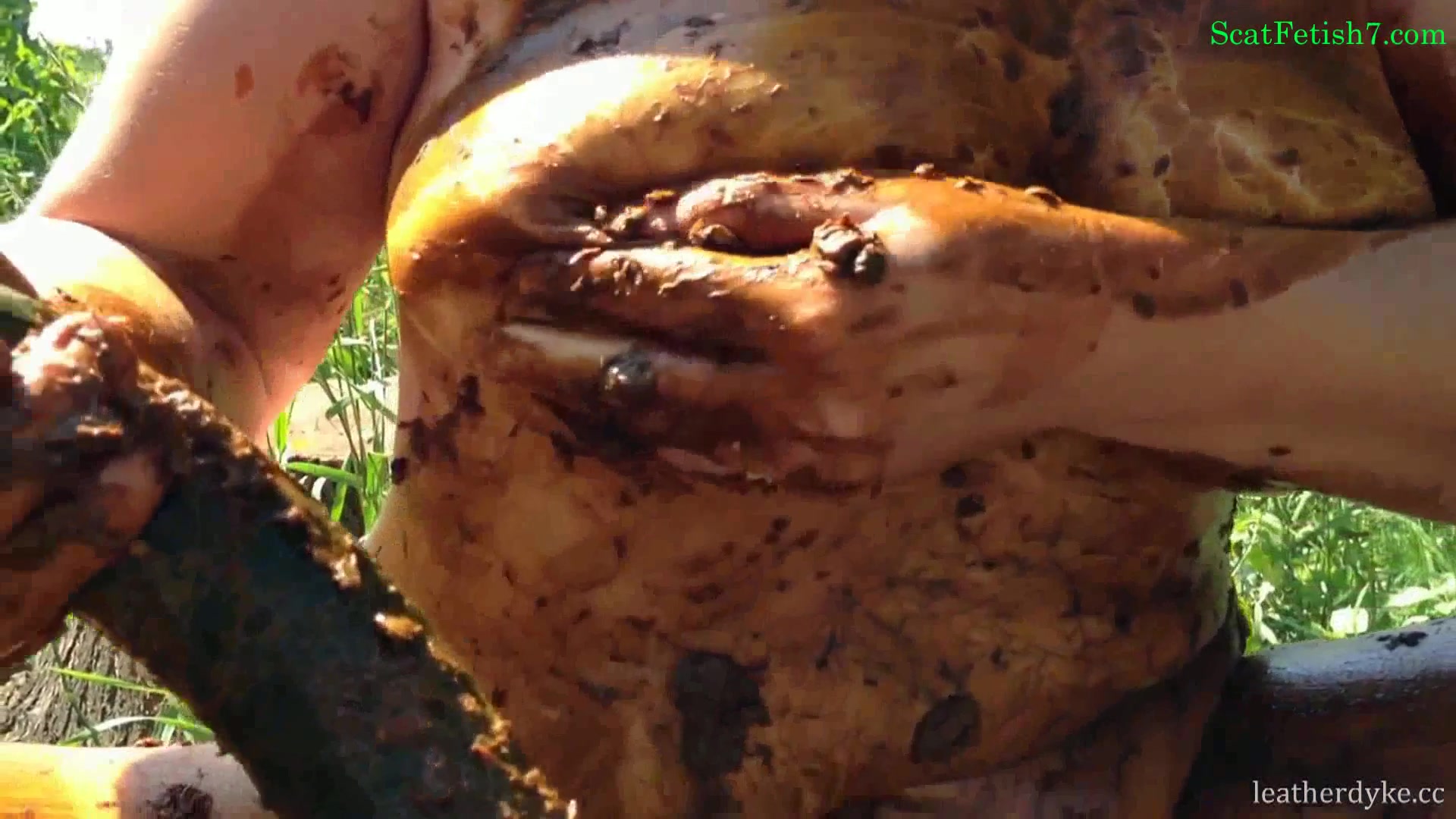 BBW babe covered her nude body with brown shit. She masturbates with scat in a public place.