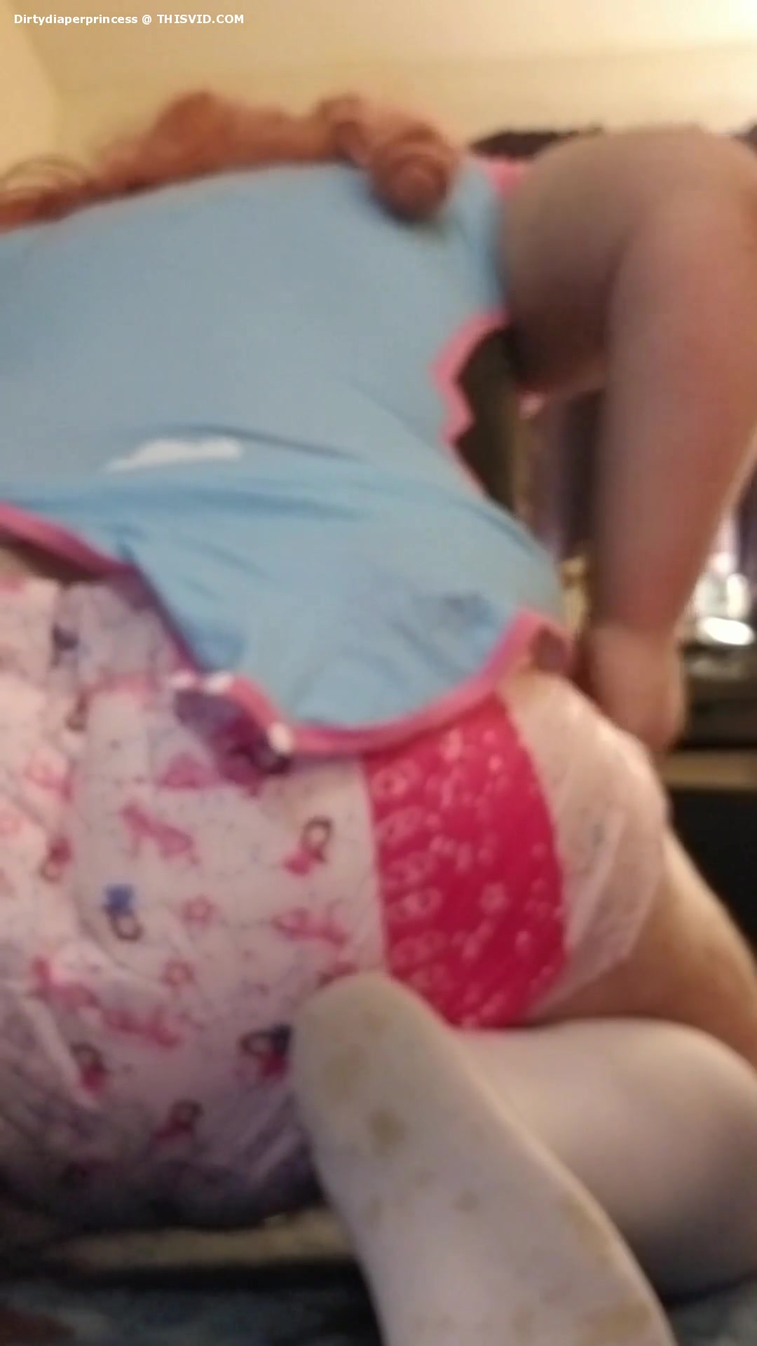 Redhead babe shits a lot in her diapers while sitting half naked on her knees.