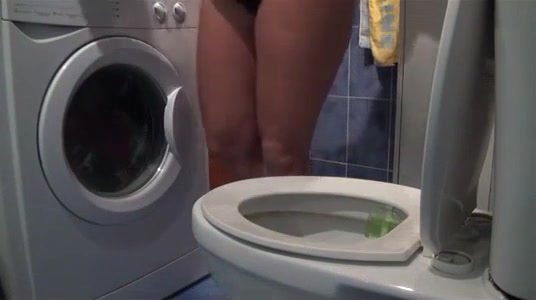 Blonde milf slaps her big ass before pooping a big one over toilet.