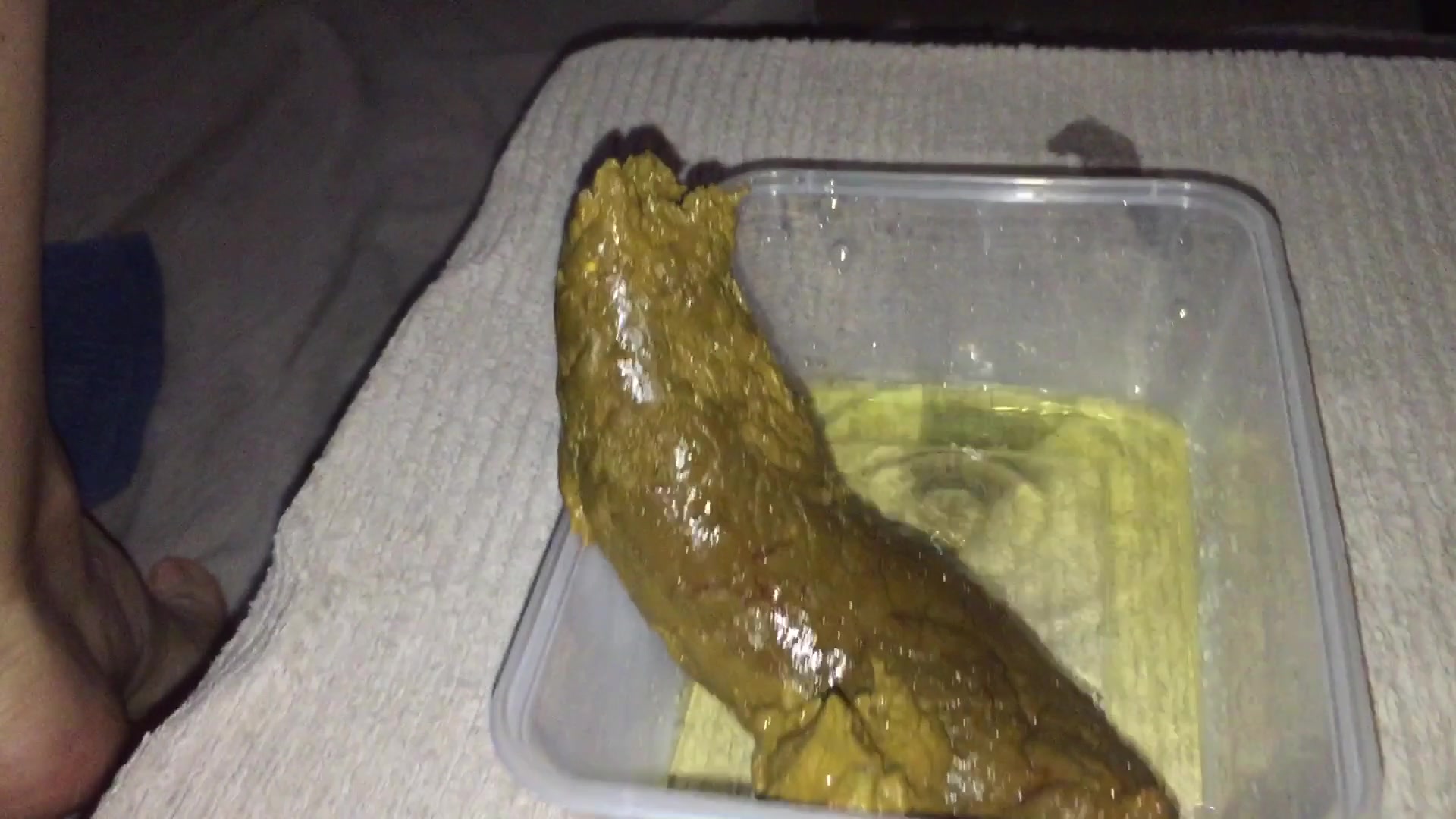 She sits on her knees and she dropped a big turd in a plastic lunch box.