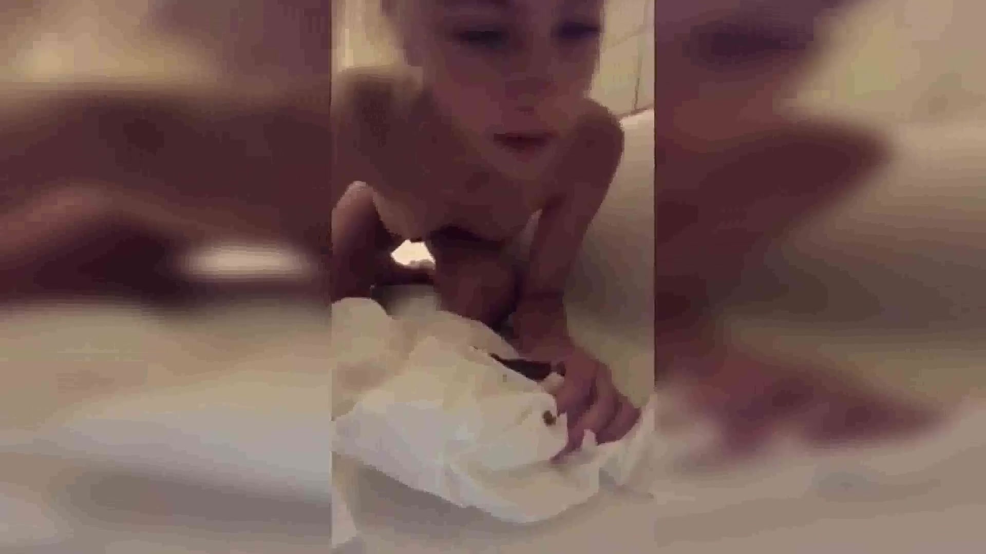 Skinny blonde sits on her knees, in the bathtub. She smears brown shit on her small tits.