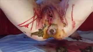 Dark haired teen that's on her period is masturbating and fisting her tight pussy. She did a real mess and didn't clean it before leaving.
