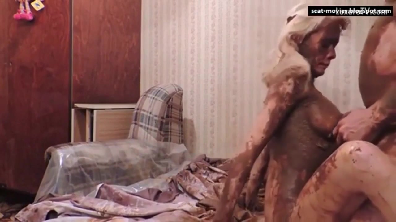 Blonde milf covered her nude body with fresh shit. She rides big cock hard and she takes a deep pussy creampie.