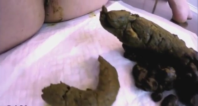 Masked brunette gets naked in front of the camera. She's pooping a lot on white napkin.
