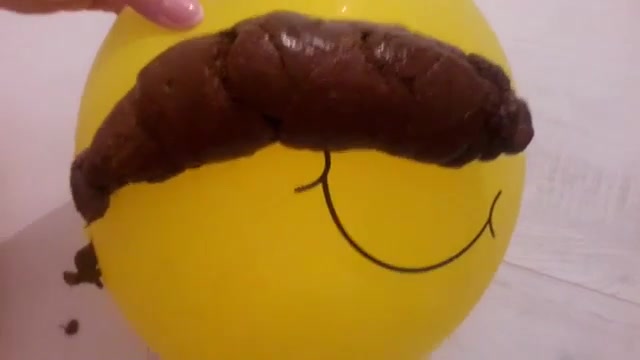 Sexy babe sits on her knees and she shits a big turd on a yellow balloon.
