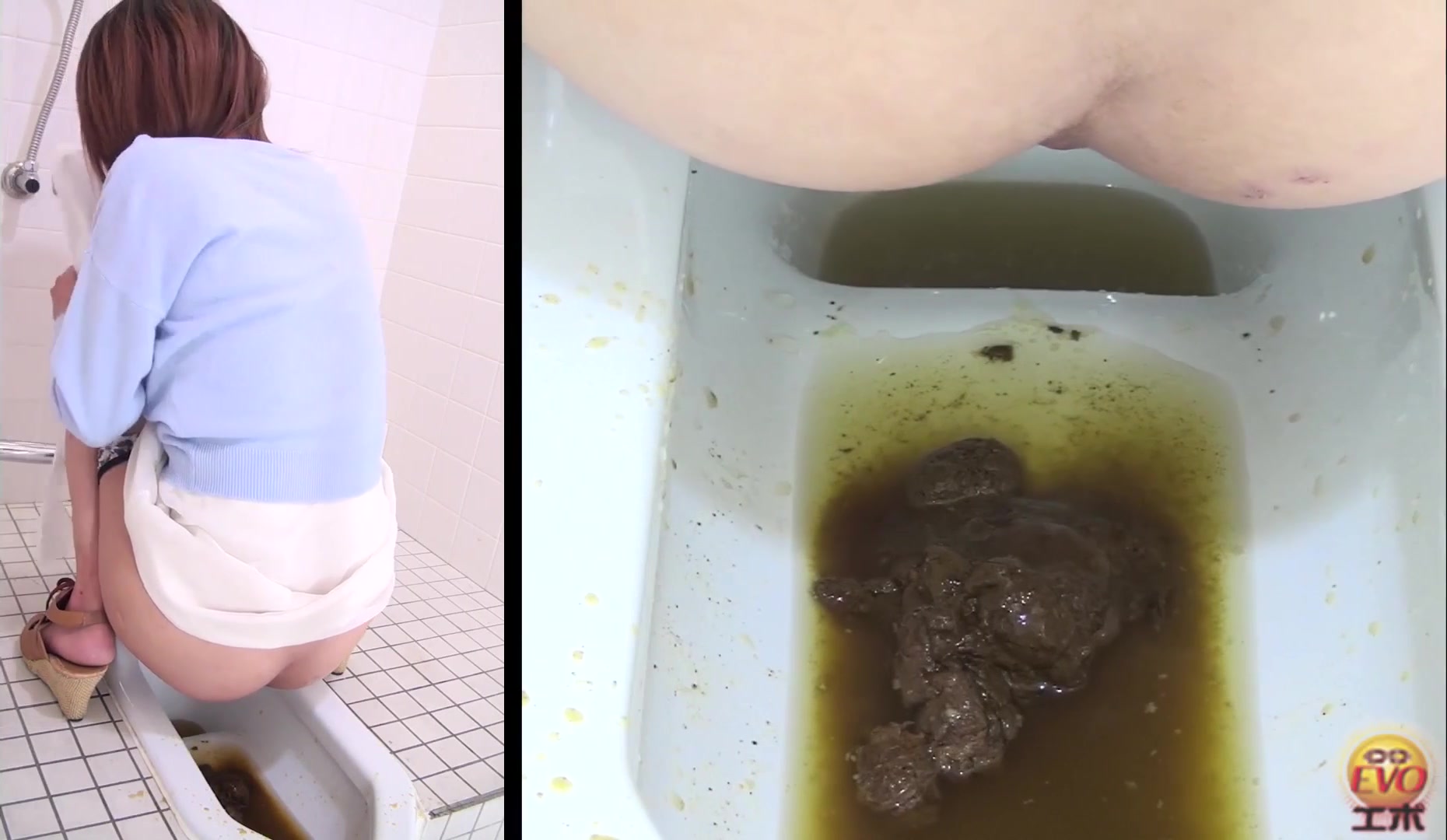 Dark haired teen spreads her legs wide opened to poop. Diarheea pressure in public bathroom.