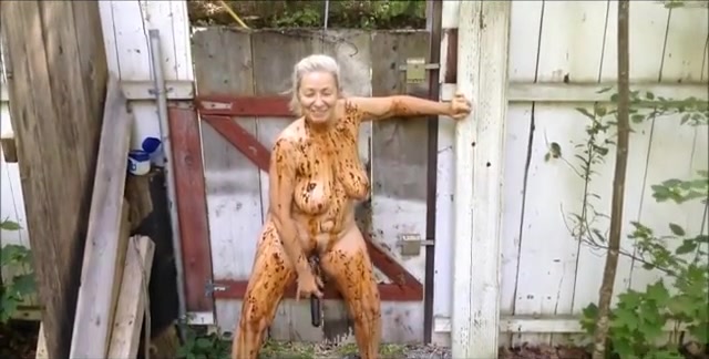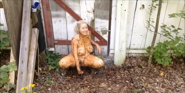 Blonde milf shits a lot in white panties. She smears brown poop on her entire body and she starts masturbating.