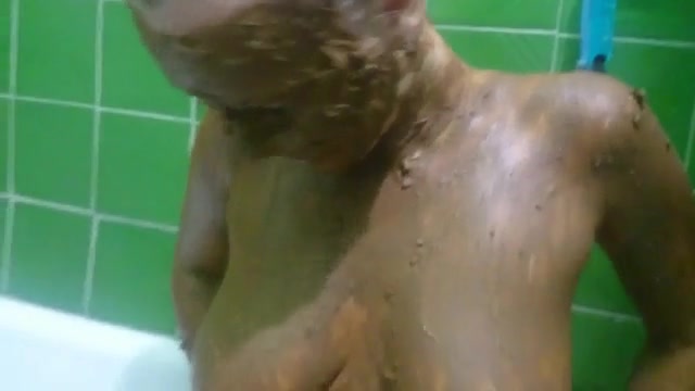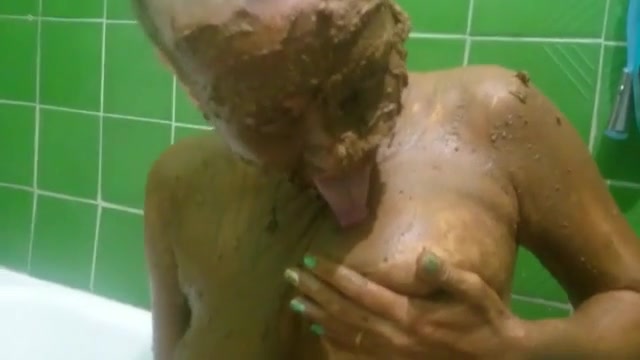 Blonde babe covered her entire body with shit. She gives a blowjob to her boyfriend, taking a facial.