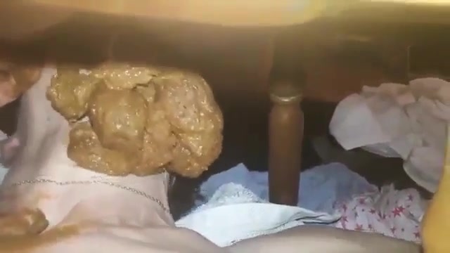 She sits naked on bedroom floor and she lets her boyfriend to poop on her entire body.