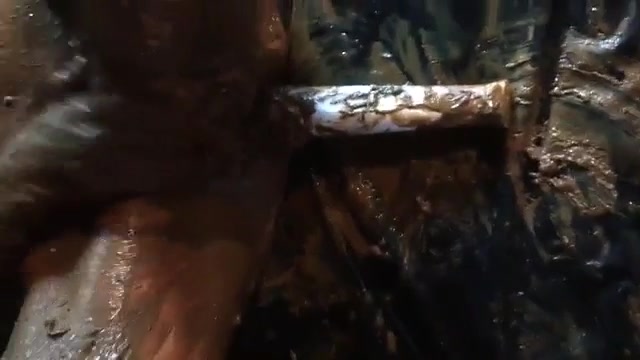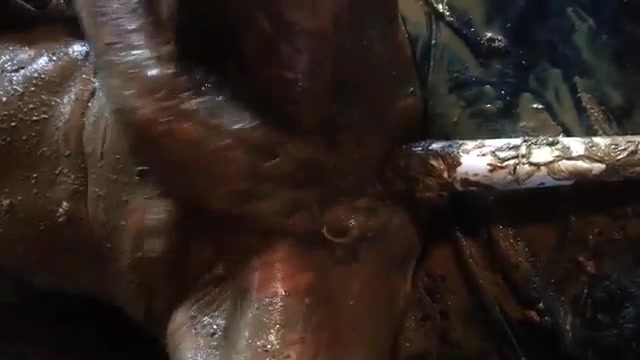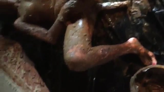 Horny babe covered entire body with brown shit. She's using a dildo machine to fuck her tight pussy.