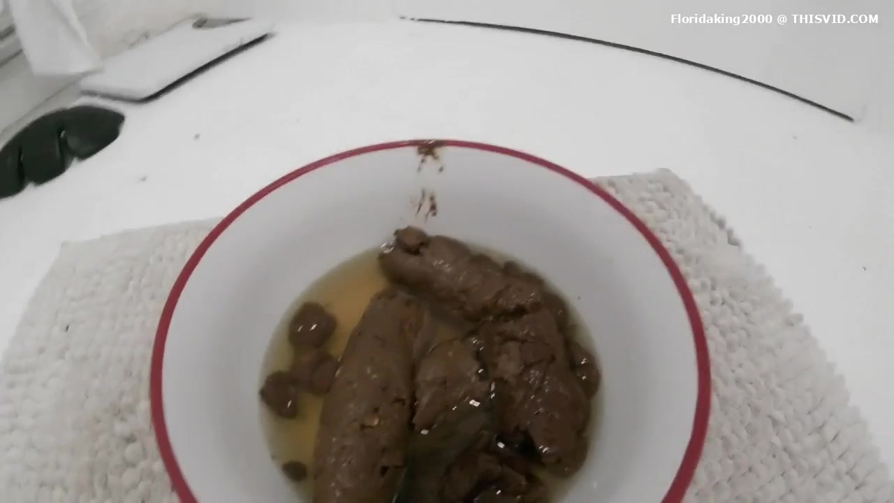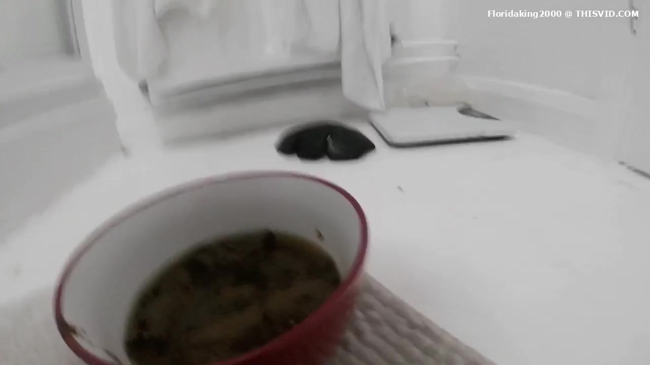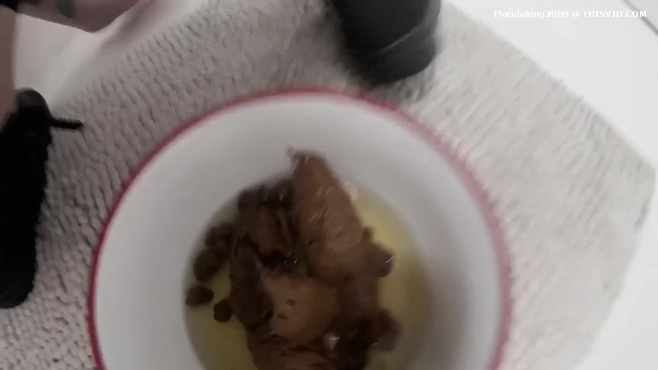 japanese babe filled a glass bowl with pee and poop. She sits half naked on her knees.