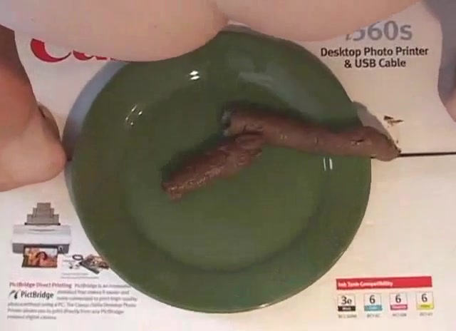 Blonde babe sits on her knees and she starts pooping two times on a plate.