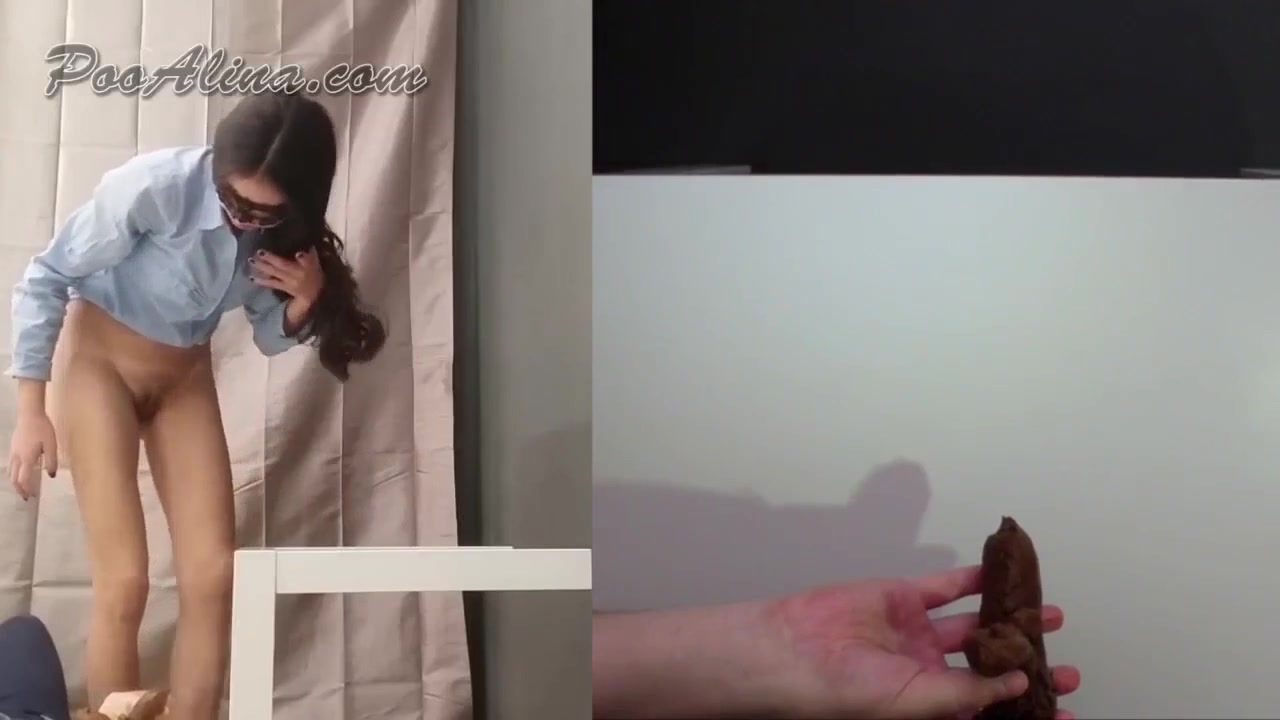 Brunette mistress slowly gets naked and she prepares to poop on a male slave.