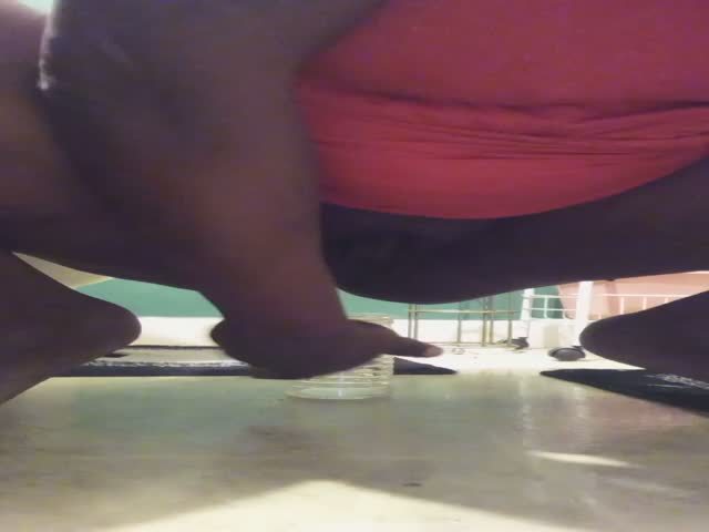 Ebony girl sits half naked on her knees and she's pushing a big one on a glass cup.