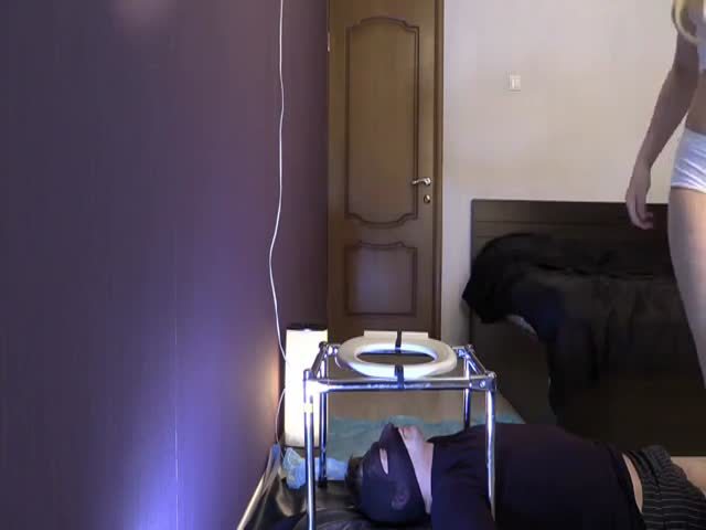 Blonde beauty sits on her knees as she's pooping a lot on slave's face.