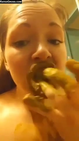 Blonde milf smears poop on her entire face. She even eats some of it.
