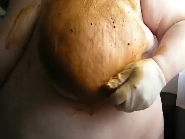 Mature babe smears brown shit on her big boobs. She lets her younger boyfriend to watch and jerk off.