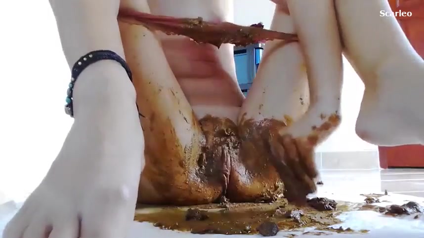 A lot of brown shit in pink lace panties. She covered her entire pussy with poop.