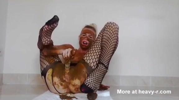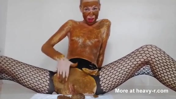 Blonde milf smears a lot of fresh poop on her entire body.