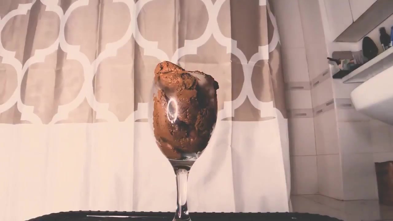 Tattooed college girl sits on her knees and she's pooping a lot in a glass.