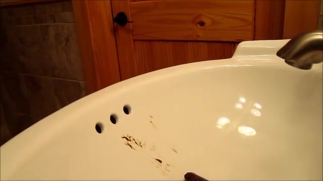 Sexy babe spreads her butt cheeks wide opened so she can easily push a big one in white sink.