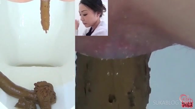 Dark haired teen sits on her knees and she starts shitting a lot on bathroom floor.