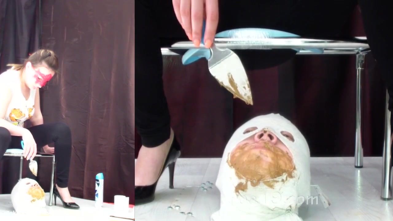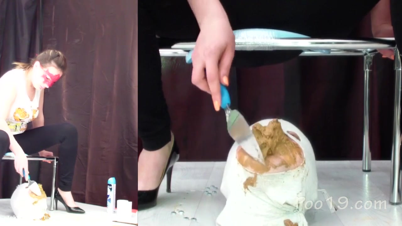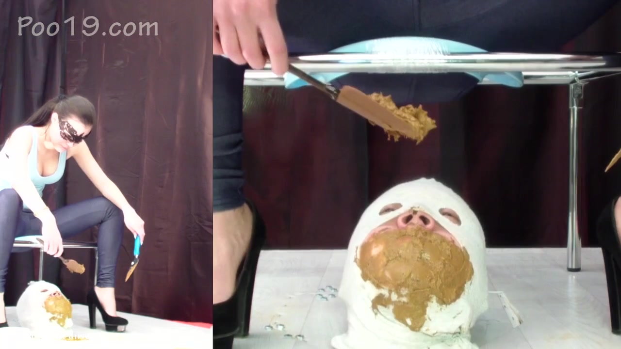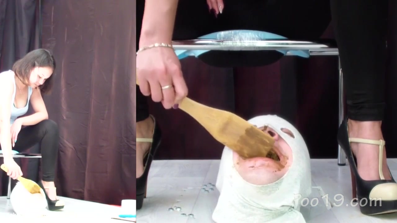 male slave is good at eating poop from three girls. They feed him with lots of shit.