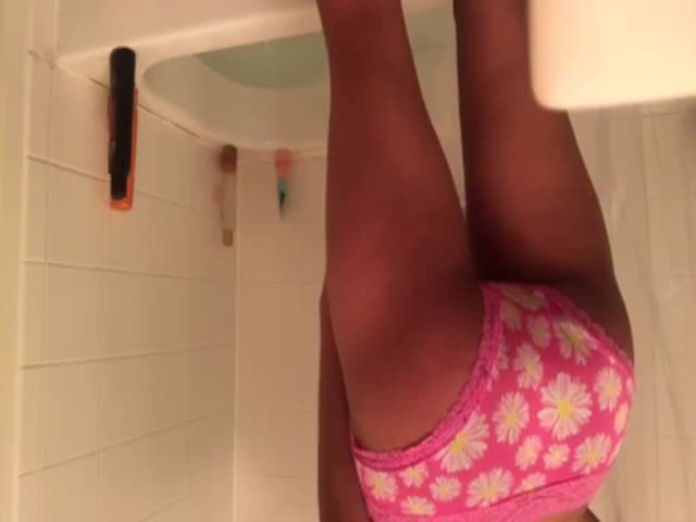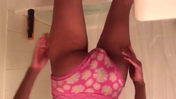 Ebony girl pushing a big turd in pink panties. She's shaking her ass in front of the camera.