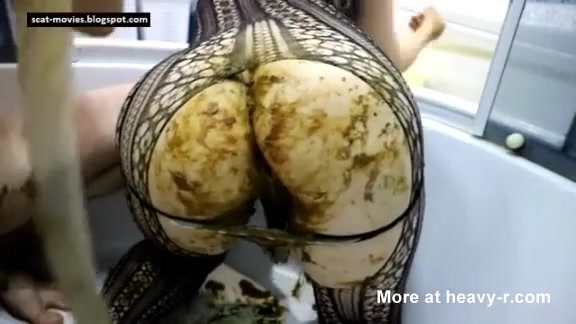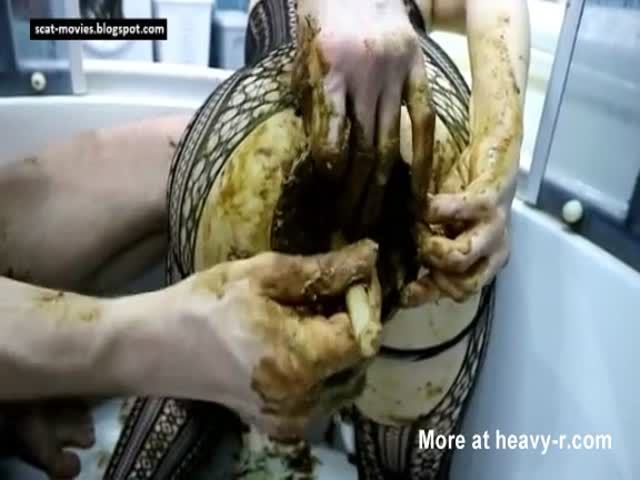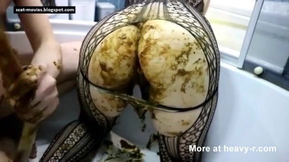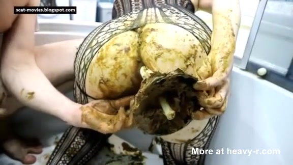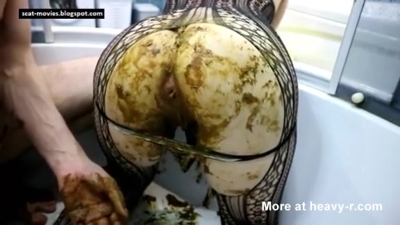 Chubby babe sits half naked on her knees and her boyfriend smears poop on her big ass before fucking her.