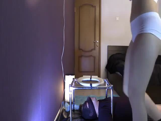 Busty blonde mistress sits half naked on homemade toilet. She's pooping a lot on slave's face.