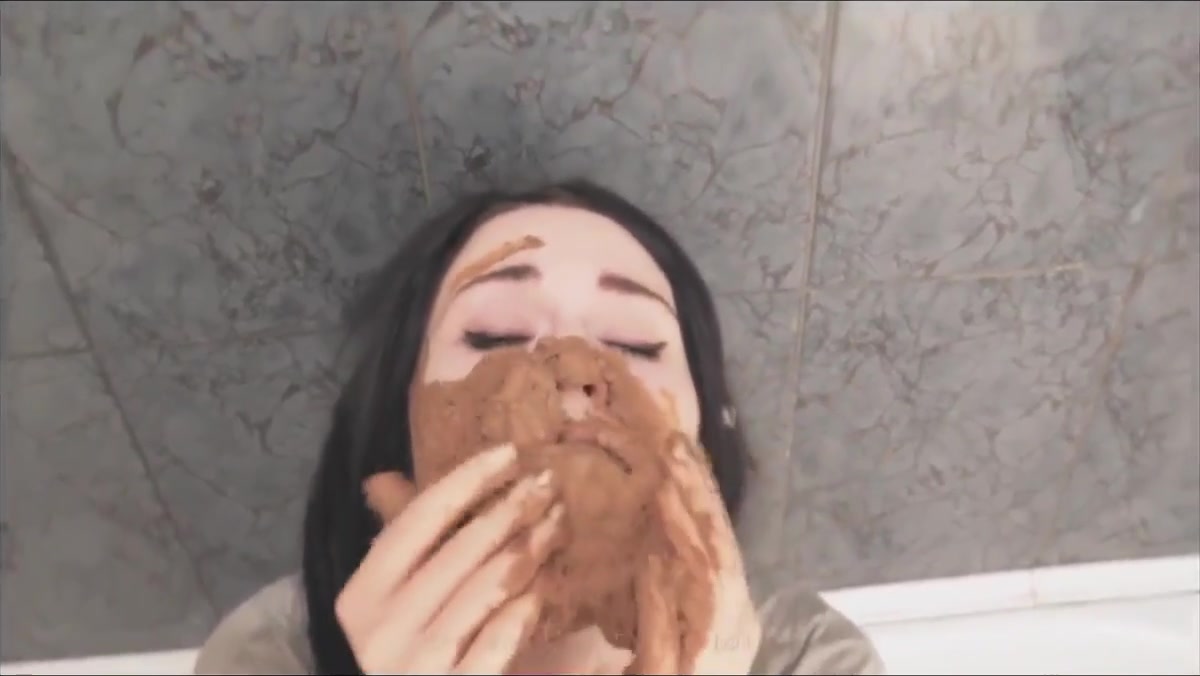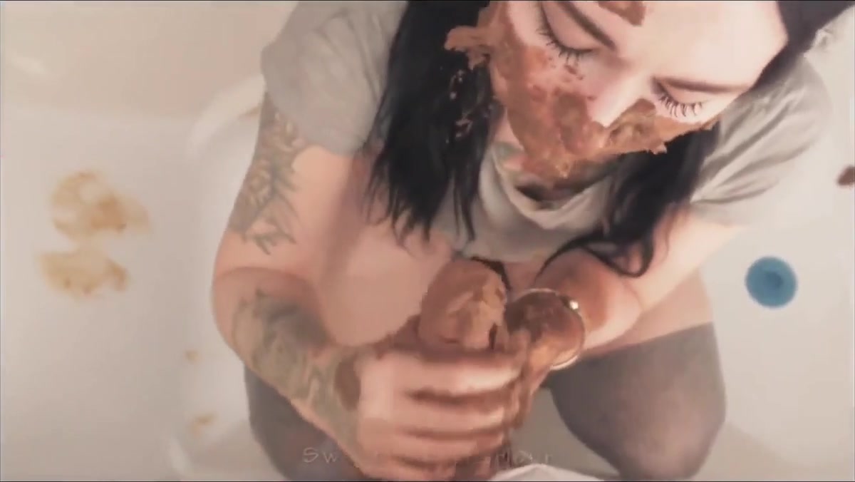 Tattooed babe smears a lot of fresh shit on her pretty face. She begs her boyfriend to cum all over her face.