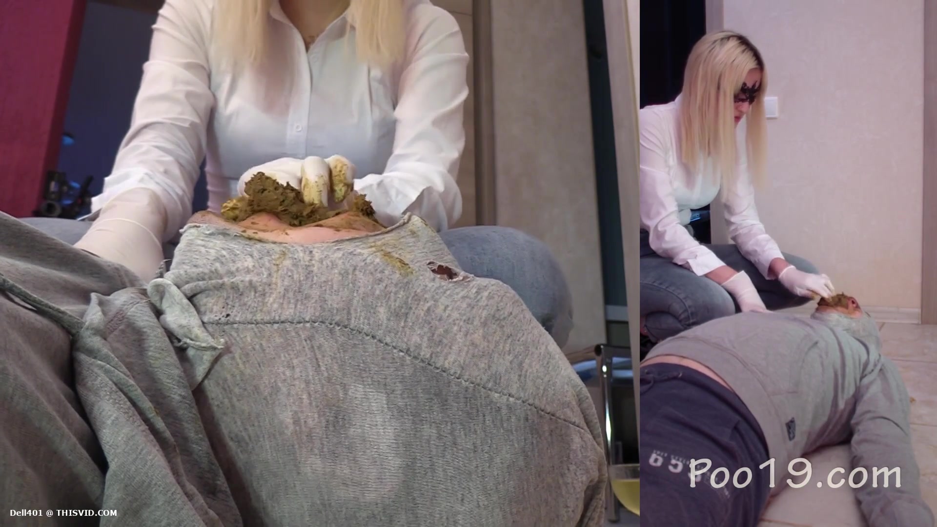Two girls use a homemade toilet to feed a male slave with lots of shit.
