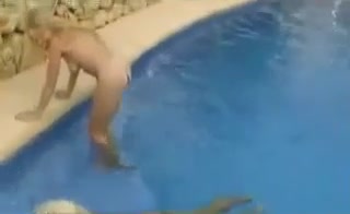 Two blonde girls poop in same time in a public pool.