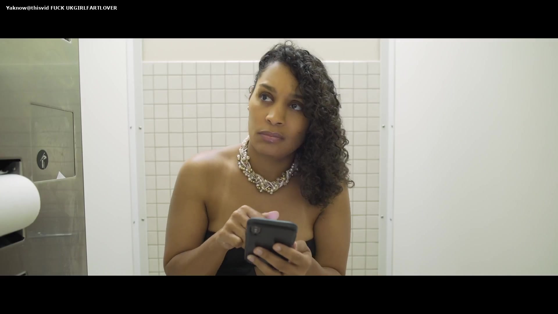 Beautiful brunette in a tight green dress is pooping a lot over toilet.