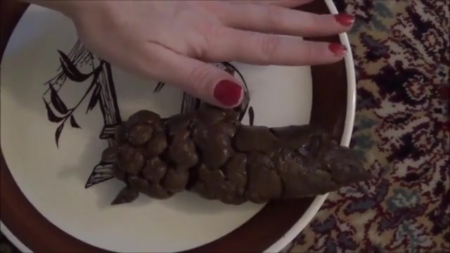 Curvy babe sits half naked on her knees as she's pooping a lot on a plate.