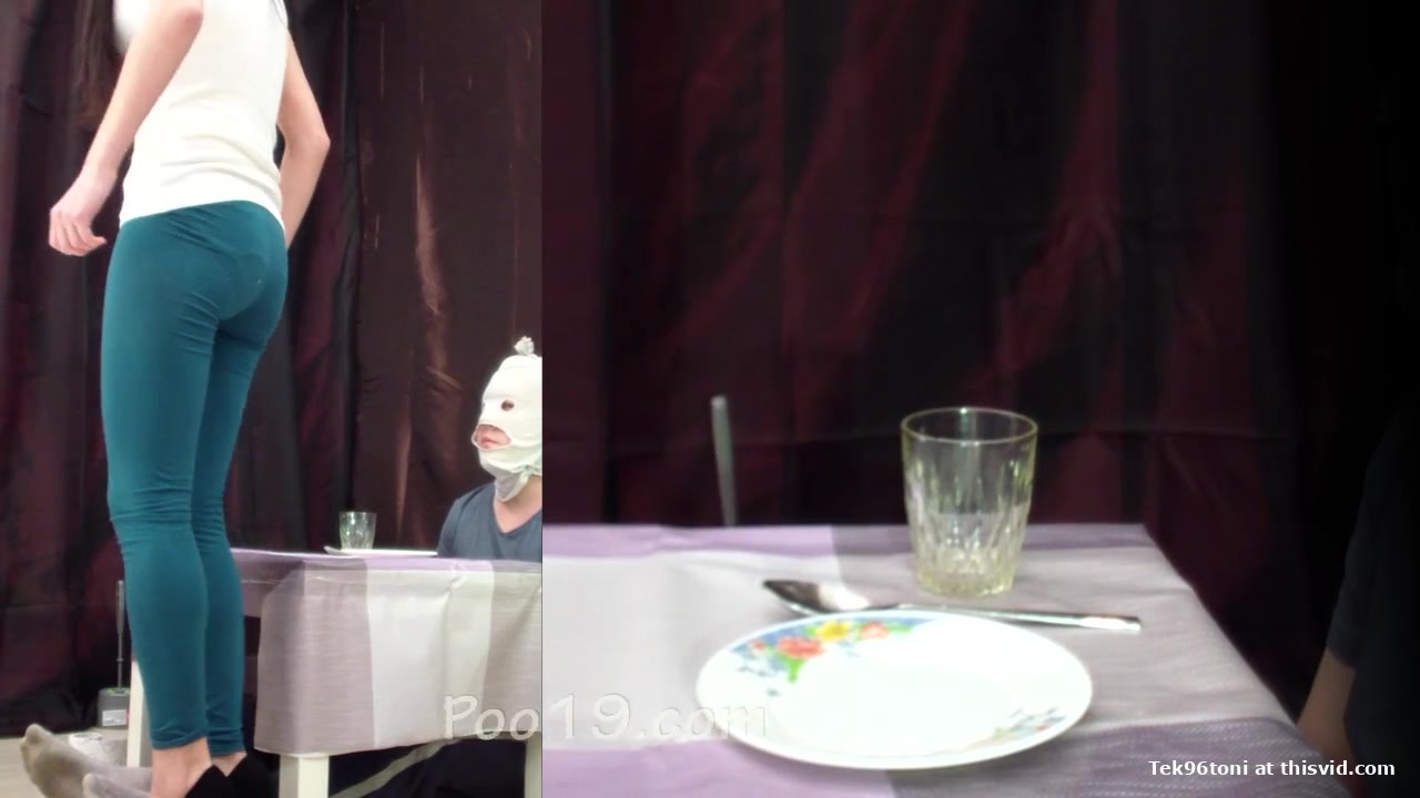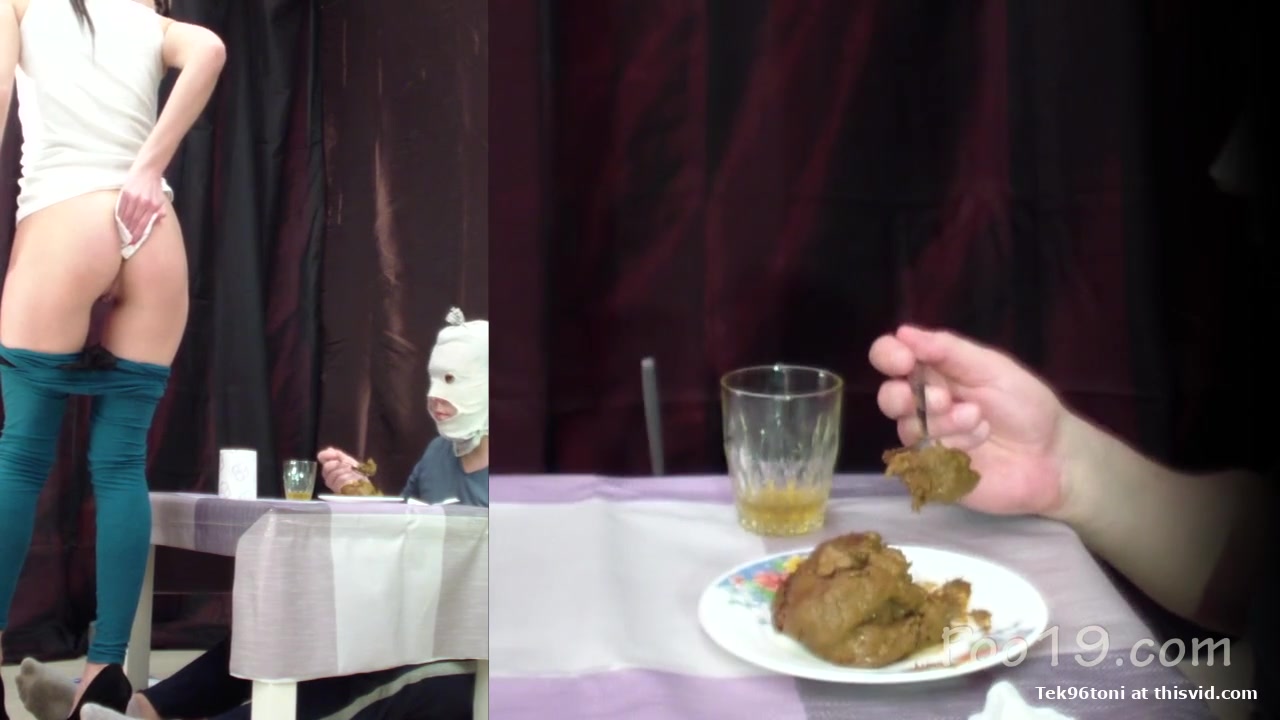 Petite girl forced her boyfriend to eat her own shit from a white plate while she's fingering her pussy.