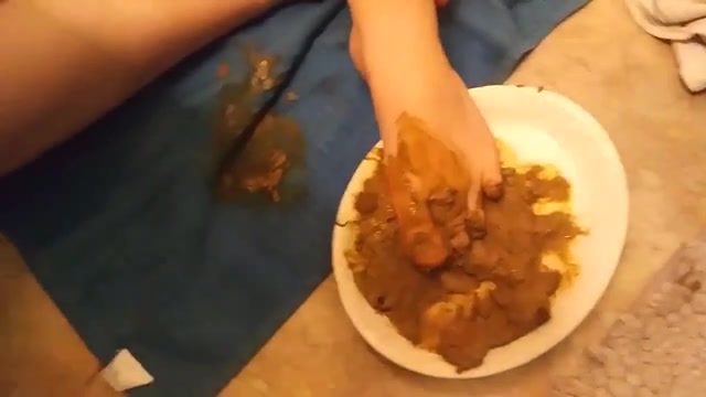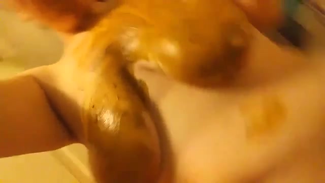 Busty redhead smears brown shit on entire body. She masturbates with fresh poop until reaching climax.