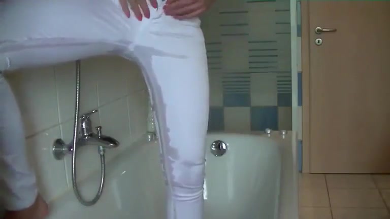 Sexy german teen shitting and peeing in white pants. She did a mess but refuses to clean it.