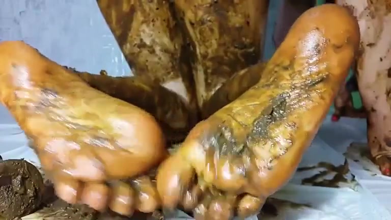Dark haired babe smears fresh shit on her sexy feet. She smears poop on pussy and starts masturbating.