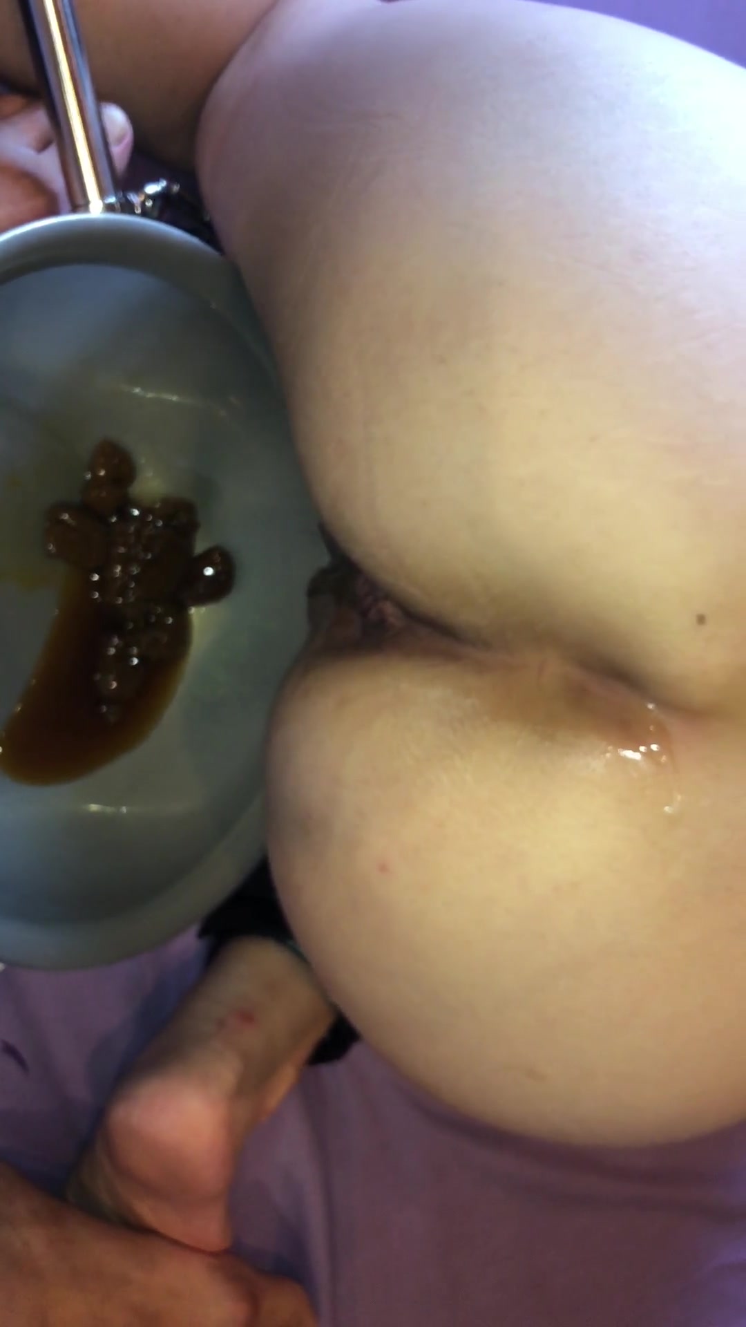 Japanese babe is pooping a lot in a bowl. She slaps her sexy ass hard.